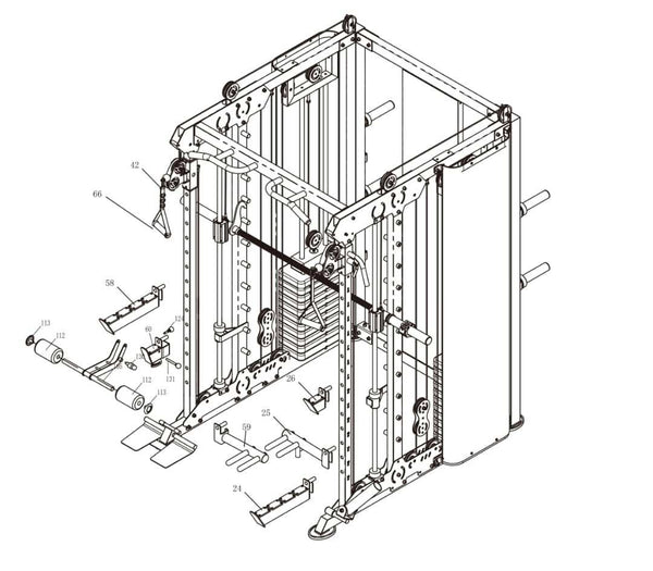 Fully loaded version of A FUNCTIONAL TRAINER, adjustable high/low cable station and low row stations design for single arm movements. Standard with built-in chin up bar, Olympic bar storage and weight plates storage. Smith press bar easily store away to allow full accessibility for cable station workouts.